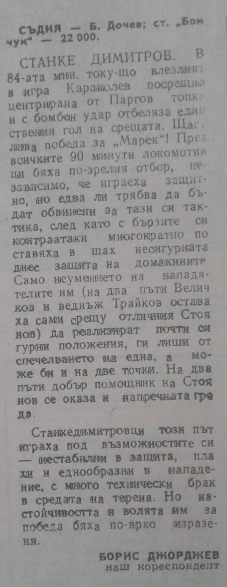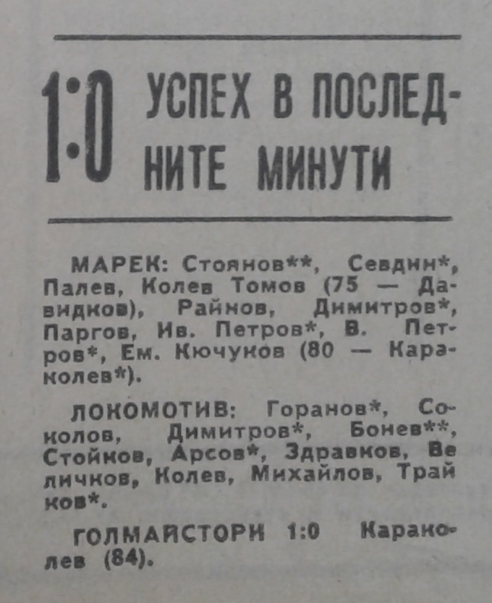 Георги Давидков (Марек) дебютировал в А РФГ. Йордан Стайков (Лок. София) провёл свой 150-й матч в А РФГ.