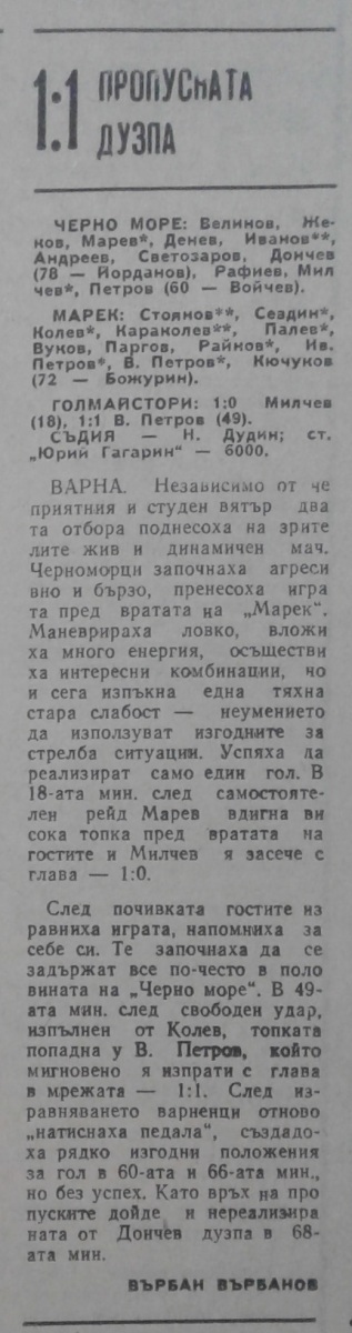 «Черно море» Варна - «Марек» Станке-Димитров - 1:1