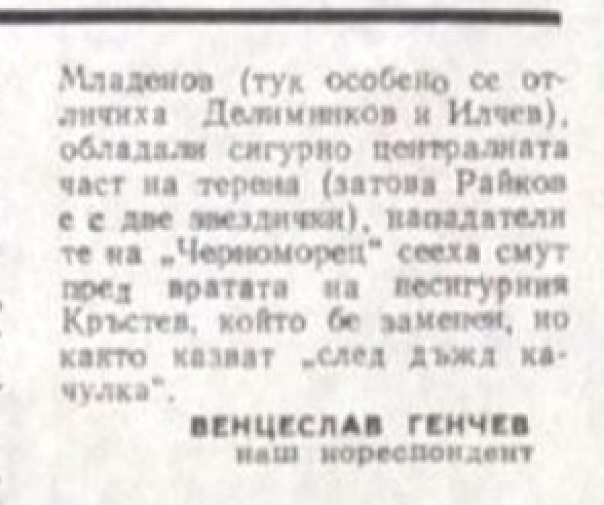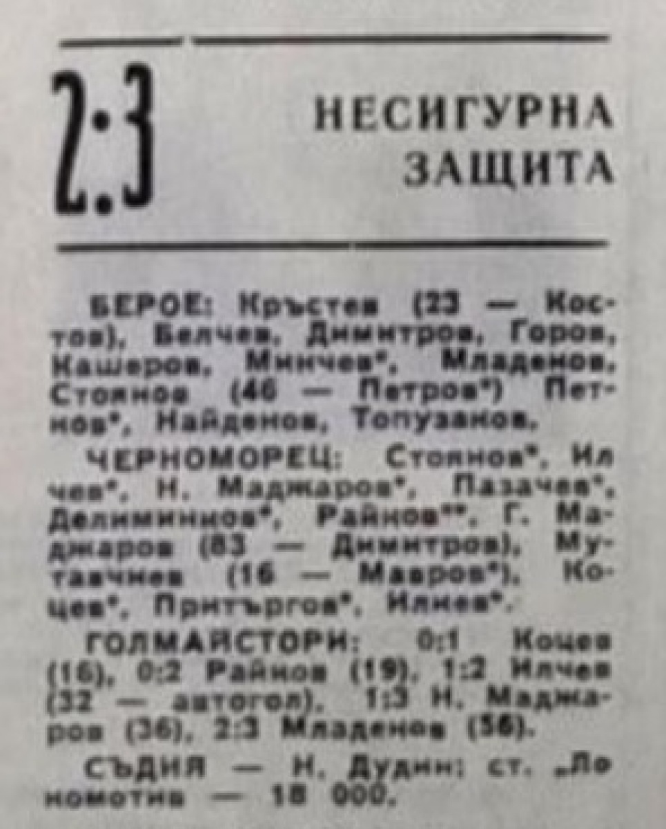 Канчо Кашеров (Берое) провёл свой 100-й матч в А РФГ (1975/76 - 28 игр, 1976/77 - 28, 1977/78 - 27, 1978/79 - 17).