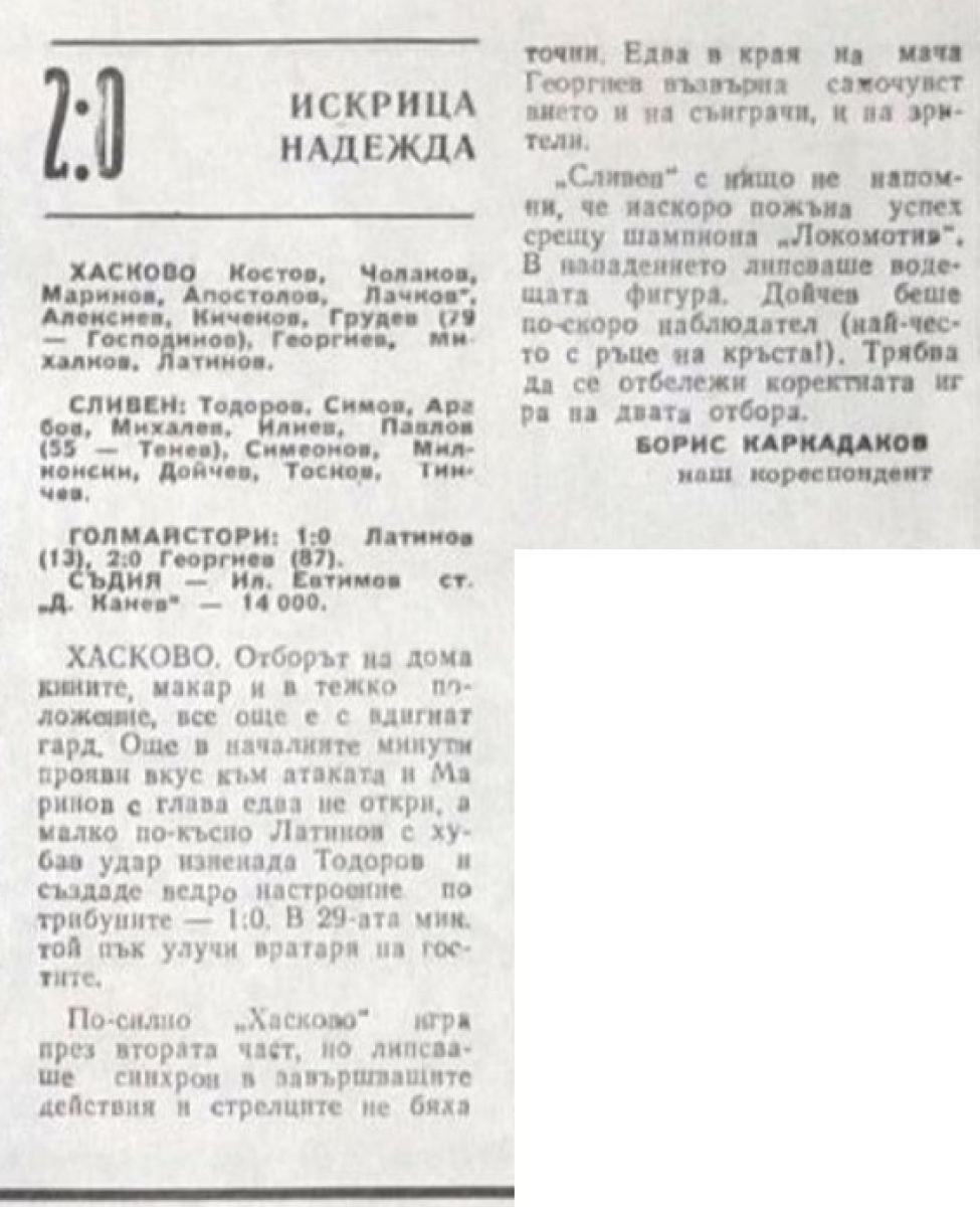 Йордан Кичеков (Хасково) провёл свой 150-й матч в А РФГ (1971/72 - 11 игр, 1972/73 - 31, 1973/74 - 16, 1974/75 - 28, 1975/76 - 18, 1976/76 - 28, 1978/79 - 18).