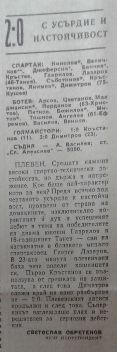 В составе Спартак Плевен дебютировали в А РФГ Лучезар Танев и Милко Гавраилов.