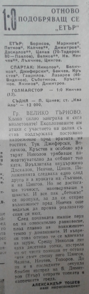 «Этыр» Велико-Тырново - «Спартак» Плевен - 1:0