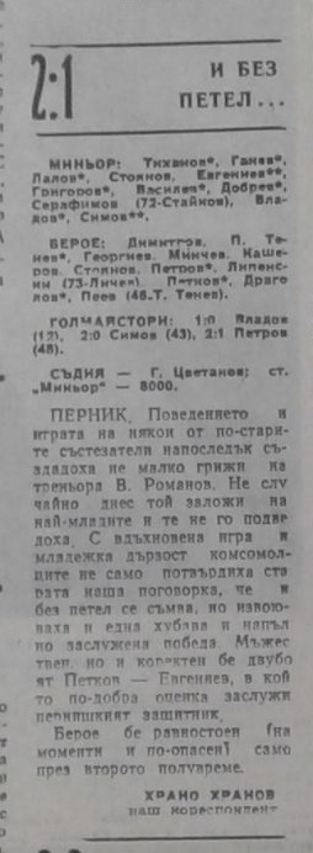 «Минёр» Перник - «Берое» Стара-Загора - 2:1