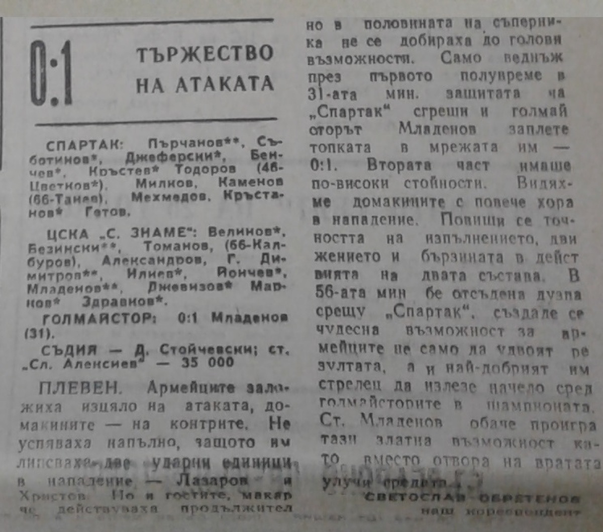 «Спартак» Плевен - «ЦСКА Септемврийско Знаме» София - 0:1