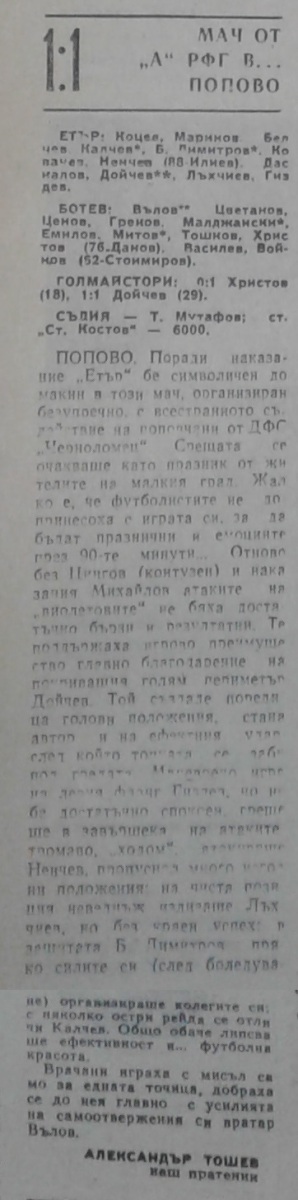 Из за недисцип. поведения своих болельщиков в последнем домашнем матче, Этыр (Велико-Тырново) провёл свой матч в г. Попово.
