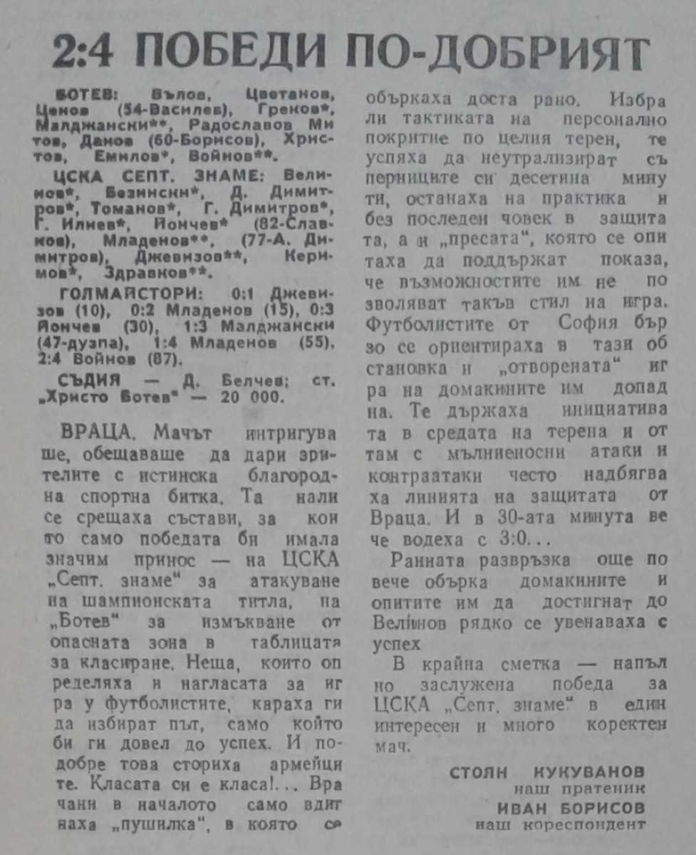 «Ботев» Враца - «ЦСКА Септемврийско Знаме» София - 2:4