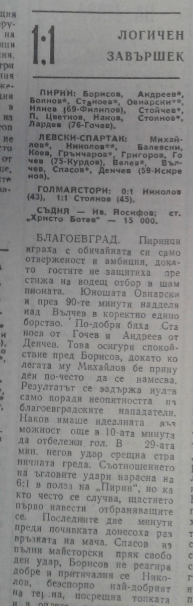 «Пирин» Благоевград - «Левски-Спартак» София - 1:1