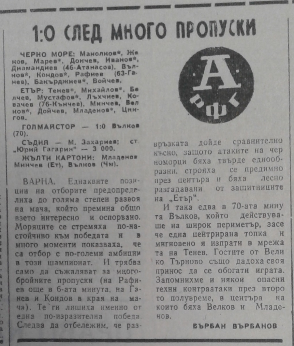 «Черно море» Варна - «Этыр» Велико-Тырново - 1:0