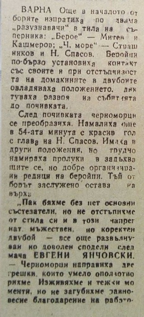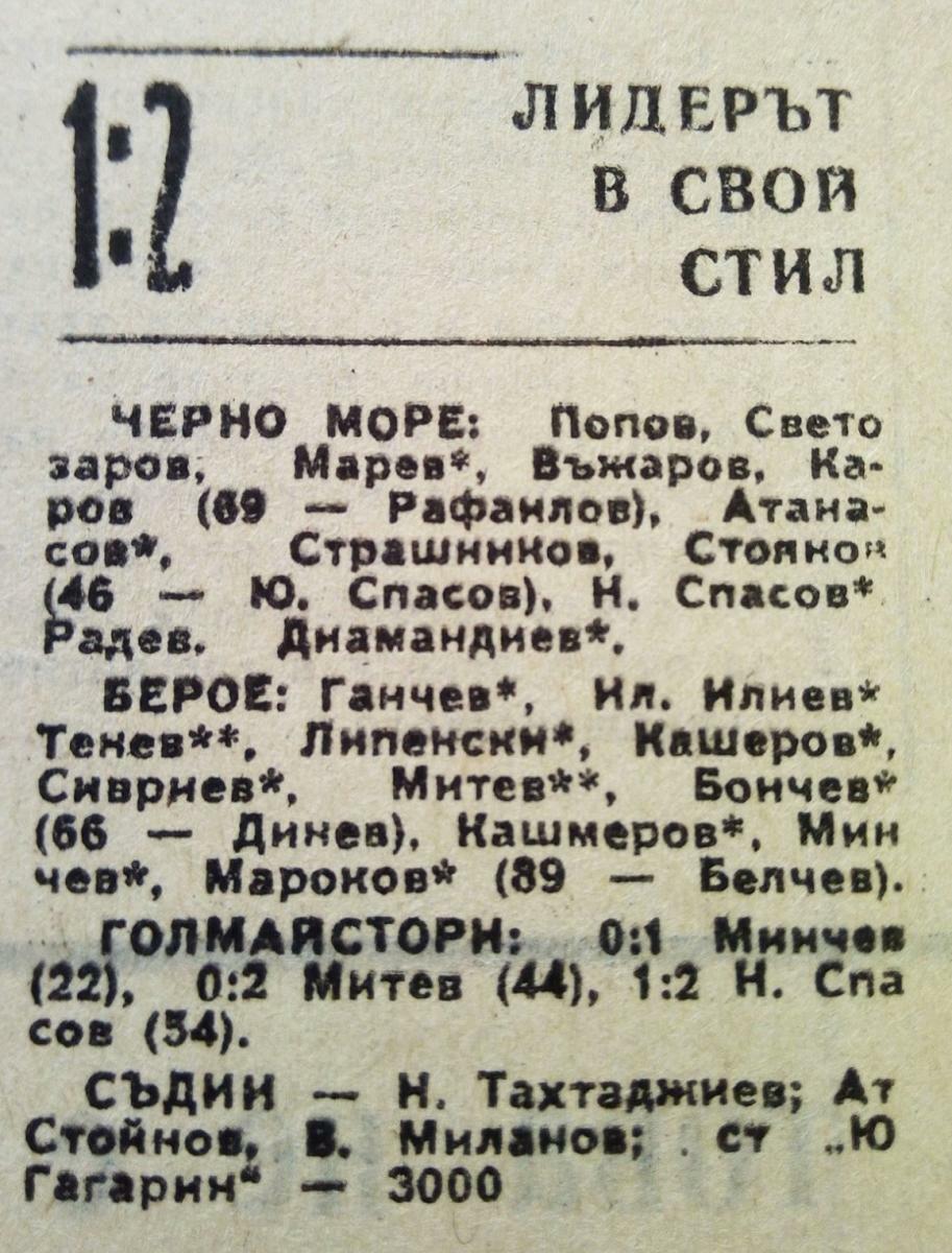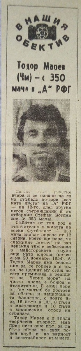 Тодор Марев (Черно Море) сыграл свой 350-й матч в высшем дивизионе \«А\» РФГ. Он стал 13-м футболистом покорившим этот рубеж за всю историю ч-в Болгарии. Лидирует в этом списке Динко Дерменджиев (Тракия) 447 игр.