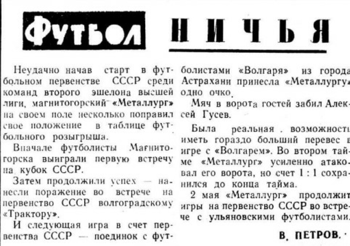 2 мая «Металлург» продолжит игры на первенство СССР во встрече с ульяновскими футболистами.