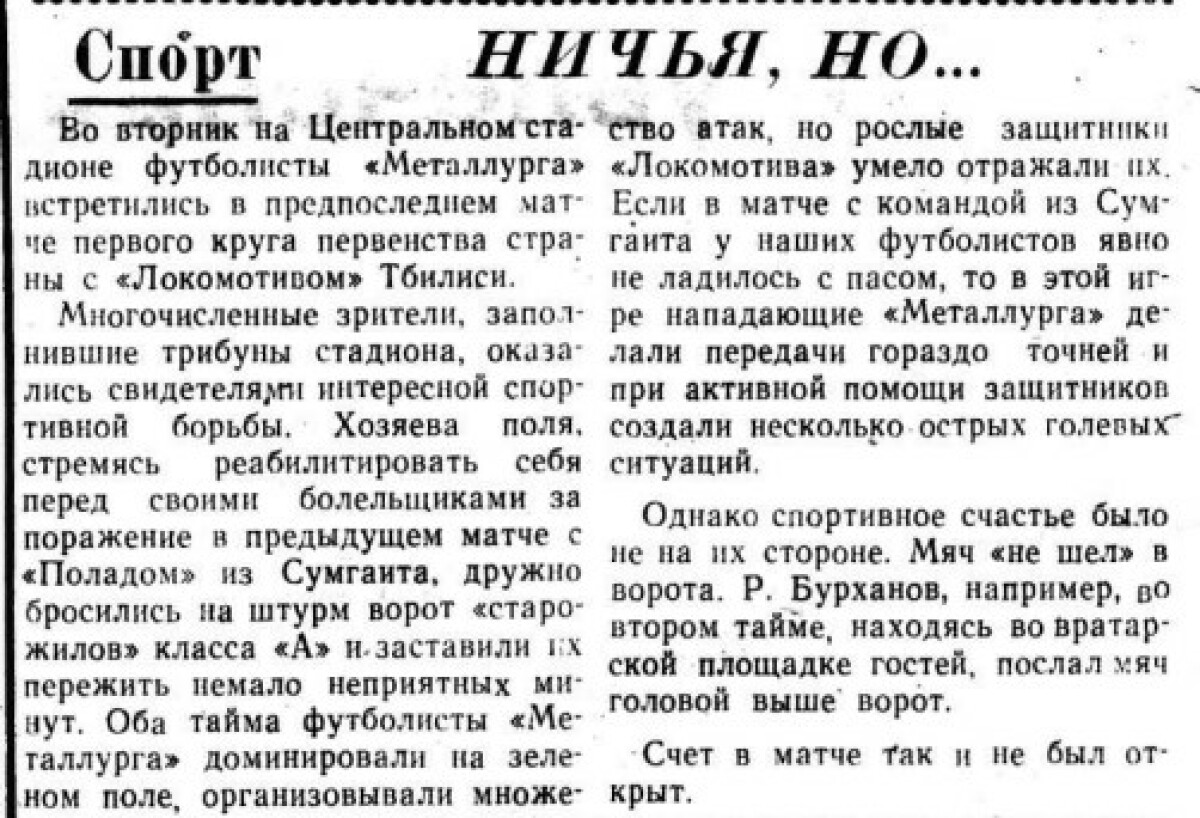 Во вторник на Центральном стадионе футболисты «Металлурга» встретились в предпоследнем матче первого круга первенства страны с «Локомотивом» Тбилиси. Многочисленные зрители, заполнившие трибуны стадиона, оказались свидетелями интересной спортивной борьбы. Хозяева поля, стремясь реабилитировать себя перед своими болельщиками за поражение в предыдущем матче с «Поладом» из Сумгаита, дружно бросились на штурм ворот «старожилов» класса «А» и заставили их пережить немало неприятных минут. Оба тайма футболисты «Металлурга» доминировали на зеленом поле, организовывали множество атак, но рослые защитники «Локомотива» умело отражали их. Если в матче с командой из Сумгаита у наших футболистов явно не ладилось с пасом, то в этой игре нападающие «Металлурга» делали передачи гораздо точней и при активной помощи защитников создали несколько острых голевых ситуаций. Однако спортивное счастье было не на их стороне. Мяч «не шел» в ворота. Р. Бурханов, например, во втором тайме, находясь во вратарской площадке гостей, послал мяч головой выше ворот. Счет в матче так и не был открыт.