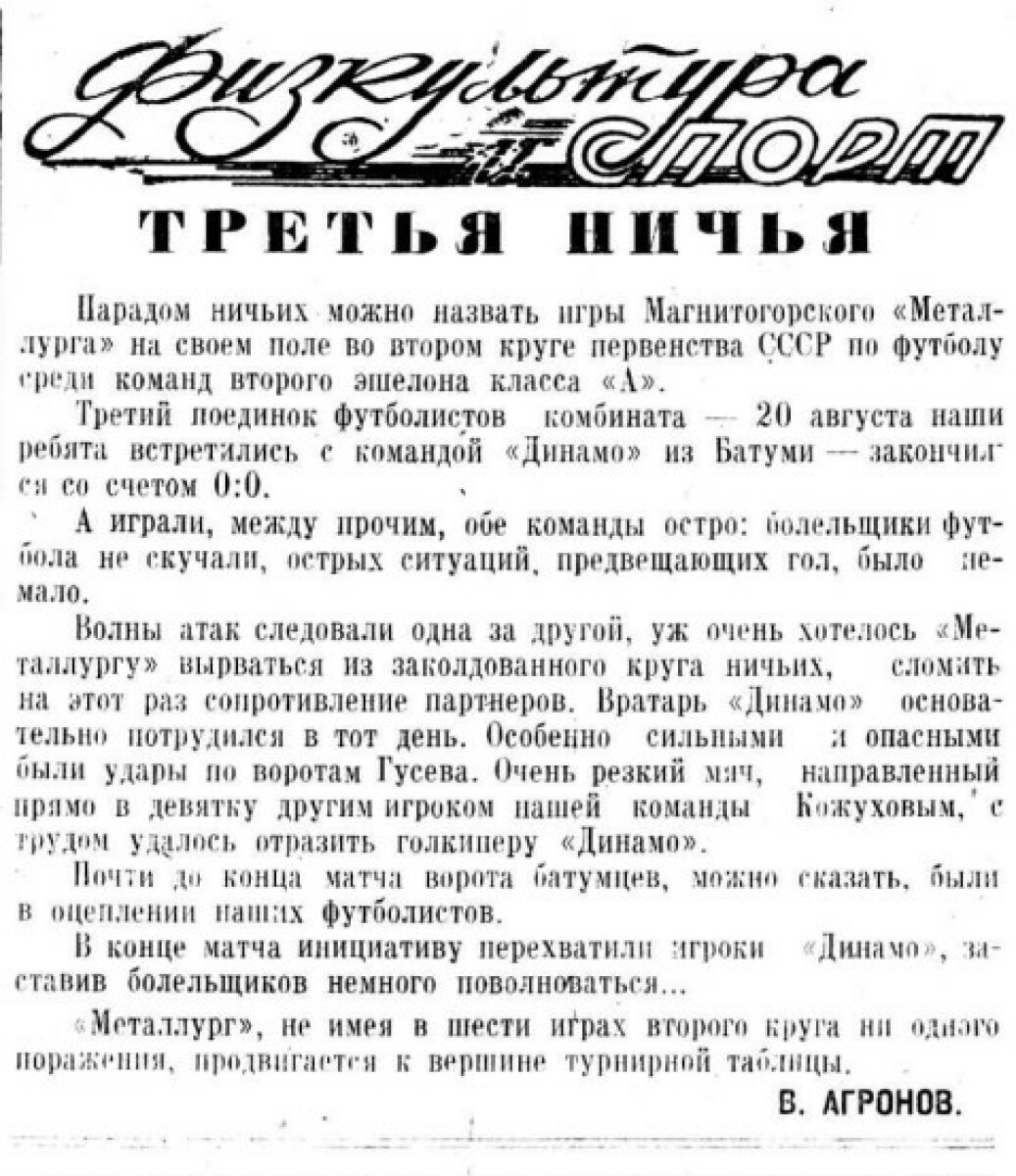Парадом ничьих можно назвать игры магнитогорского «Металлурга» на своем поле во втором круге первенства СССР по футболу среди команд второго эшелона класса «А». Третий поединок футболистов комбината — 20 августа наши ребята встретились с командой «Динамо» из Батуми — закончился со счетом 0:0. А играли, между прочим, обе команды остро: болельщики футбола не скучали, острых ситуаций, предвещающих гол, было немало. Волны атак следовали одна за другой, уж очень хотелось «Металлургу» вырваться из заколдованного круга ничьих, сломить на этот раз сопротивление партнеров. Вратарь «Динамо» основательно потрудился в тот день. Особенно сильными и опасными были удары по воротам Гусева. Очень резкий мяч, направленный прямо в девятку другим игроком нашей команды Кожуховым, с трудом удалось отразить голкиперу «Динамо». Почти до конца матча ворота батумцев, можно сказать, были в оцеплении наших футболистов. В конце матча инициативу перехватили игроки «Динамо», заставив болельщиков немного поволноваться... «Металлург», не имея в шести играх второго круга ни одного поражения, продвигается к вершине турнирной таблицы.