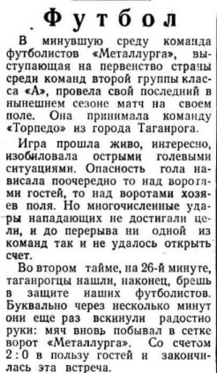 В минувшую среду команда футболистов «Металлурга», выступающая на первенство страны среди команд второй группы класса «А», провела свой последний в нынешнем сезоне матч на своем поле. Она принимала команду «Торпедо» из города Таганрога. Игра прошла живо, интересно, изобиловала острыми голевыми ситуациями. Опасность гола нависала поочередно то над воротами гостей, то над воротами хозяев поля. Но многочисленные удары нападающих не достигали цели, и до перерыва ни одной из команд так и не удалось открыть счет. Во втором тайме, на 26-й минуте, таганрогцы нашли, наконец, брешь в защите наших футболистов. Буквально через несколько минут они еще раз вскинули радостно руки: мяч вновь побывал в сетке ворот «Металлурга». Со счетом 2:0 в пользу гостей и закончилась эта встреча.