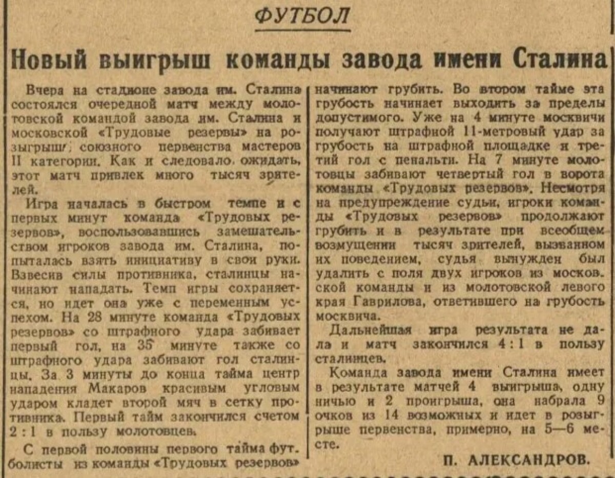 «Крылья Советов» Молотов - «Трудовые резервы» Москва - 4:1