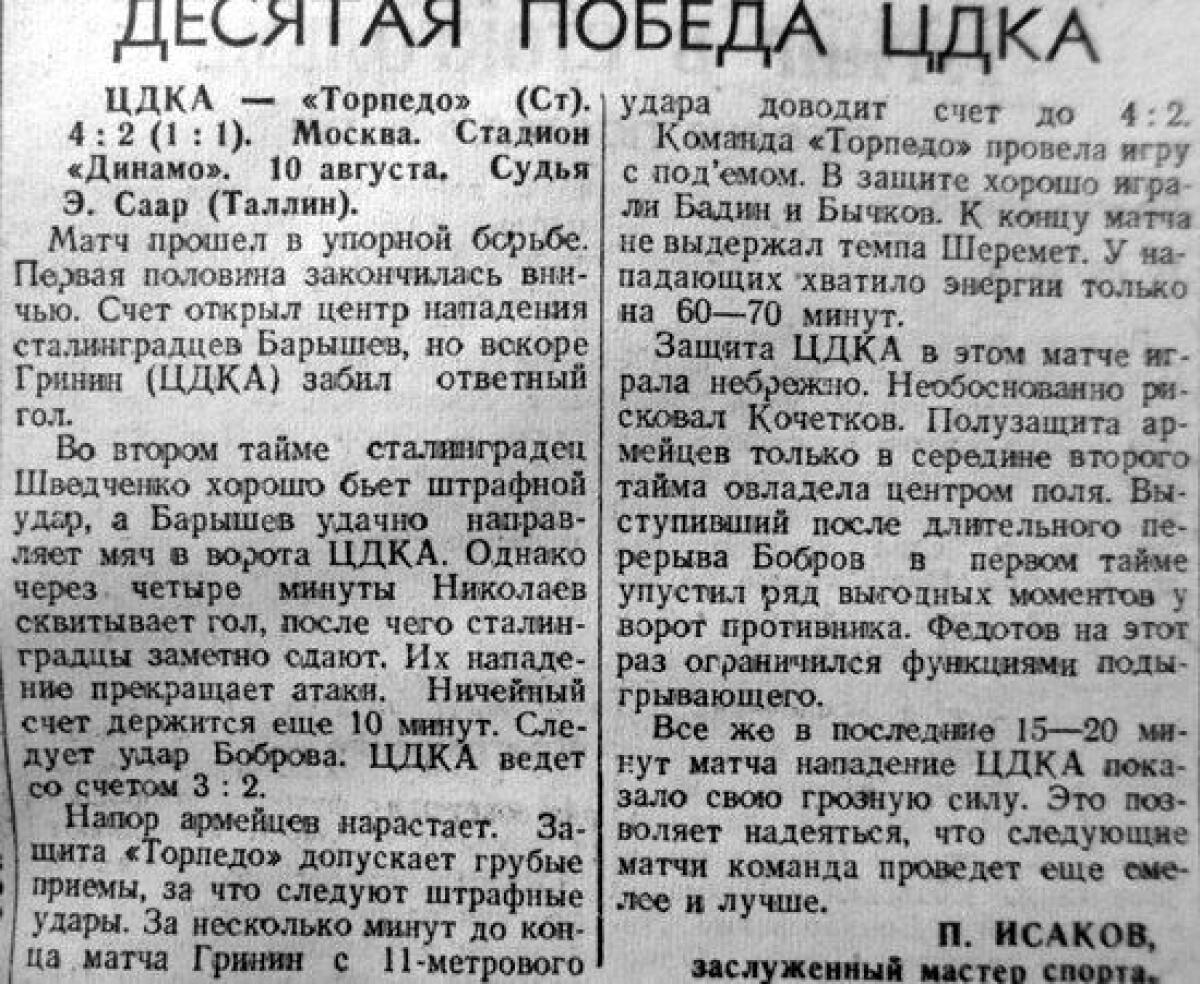 ЦДКА Москва - «Торпедо» Сталинград - 4:2