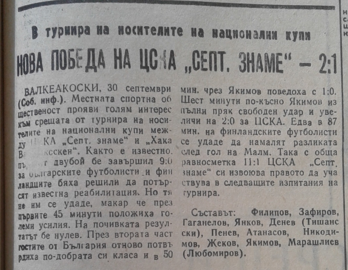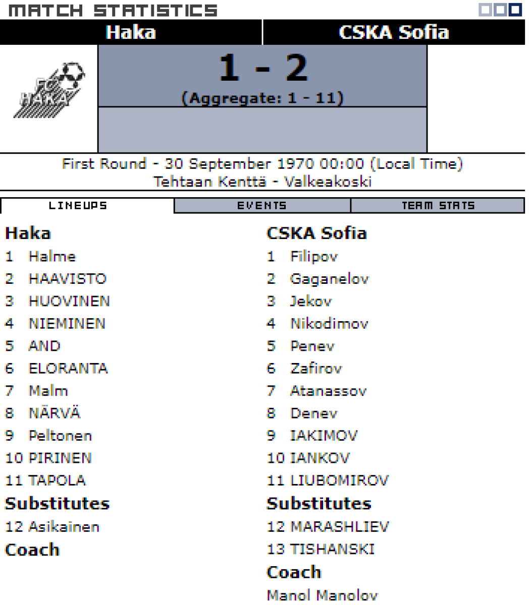 «Хака» Валкеакоски - «ЦСКА Септемврийско Знаме» София - 1:2