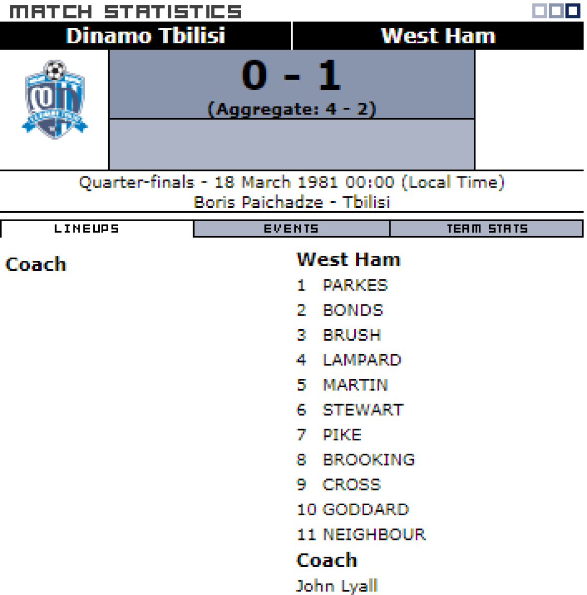 «Динамо» Тбилиси - «Вест Хэм Юнайтед» Лондон - 0:1