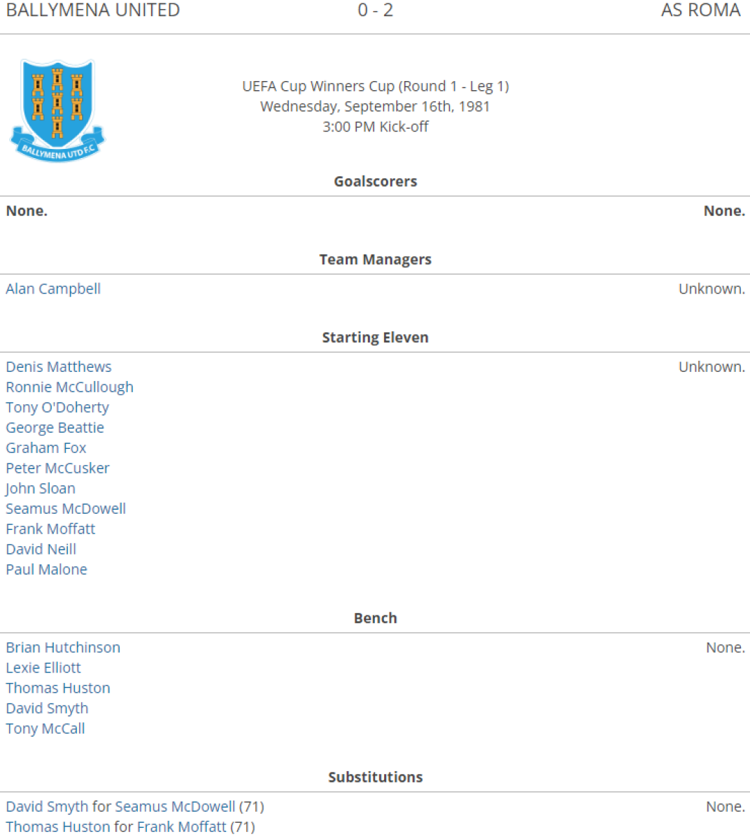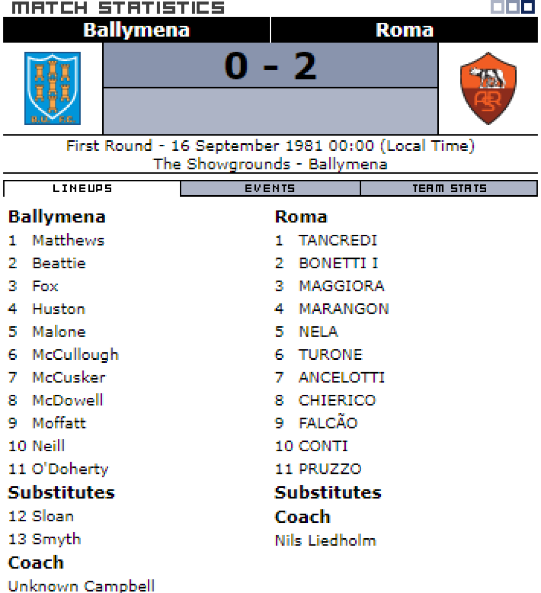 «Баллимена Юнайтед» Баллимена - «Рома» Рим - 0:2