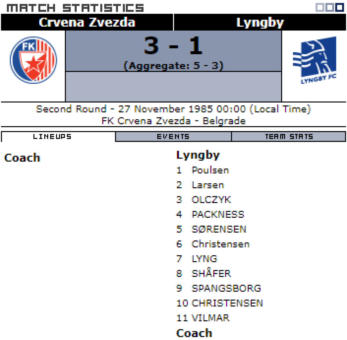Этот матч должен бал состоятся 6 ноября. Дело в том, что в югославской команде в матче 1/16 финала со швейцарским Арау выступал игрок переход которого в Црвену Звезду не был официально утверждён Югославской федерацией футбола. Датчане подали протест в УЕФА. Но УЕФА дал добро на продолжении борьбы признав, что переход был совершён без нарушения Положения.