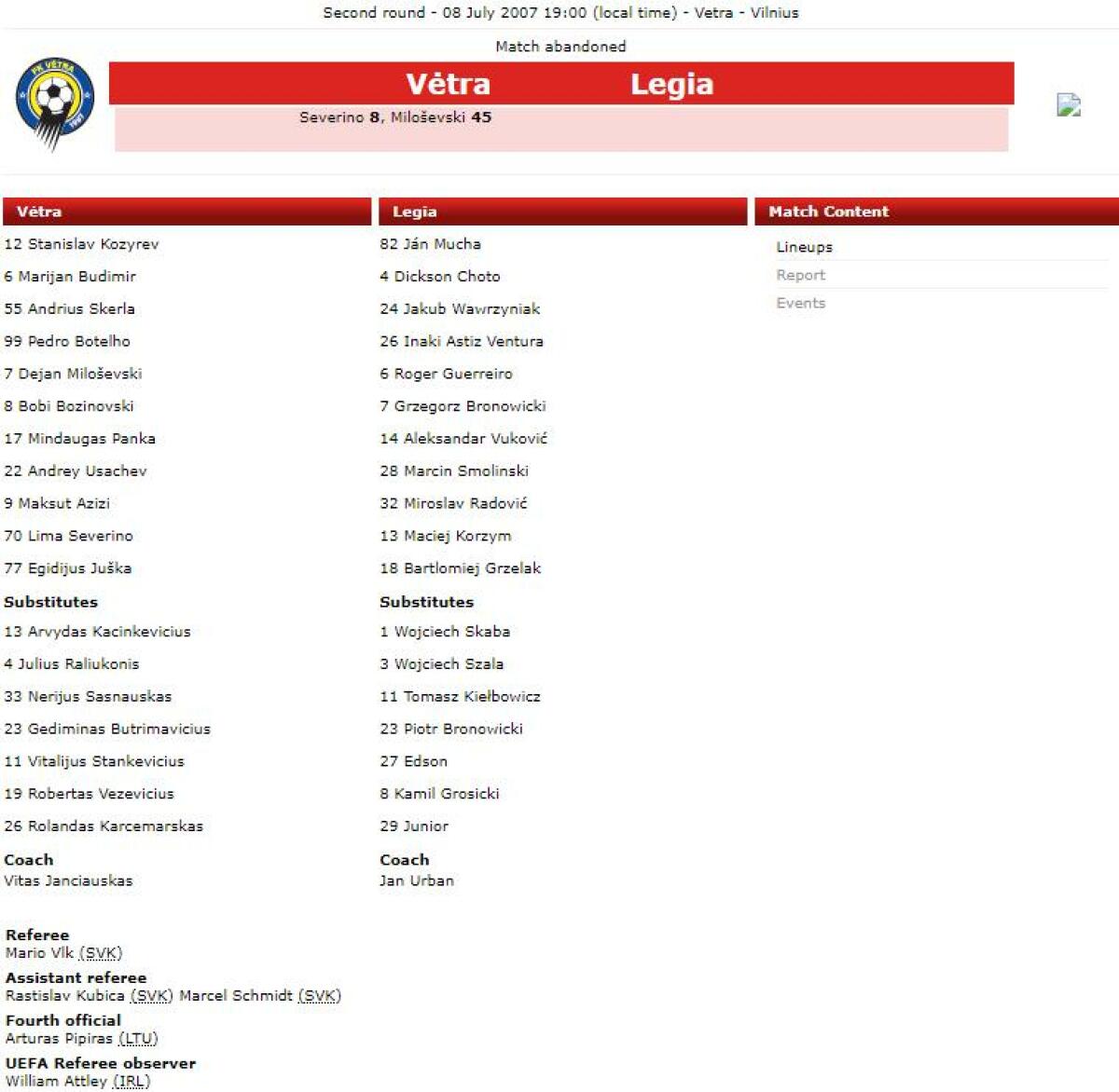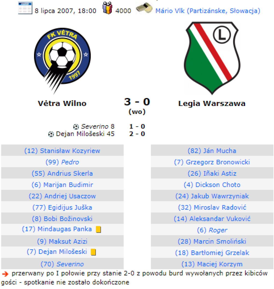 Матч прекращен после первого тайма из-за драки, устроенной болельщиками гостей. «Легии» засчитано техническое поражение и она снята с турнира без проведения ответного поединка.