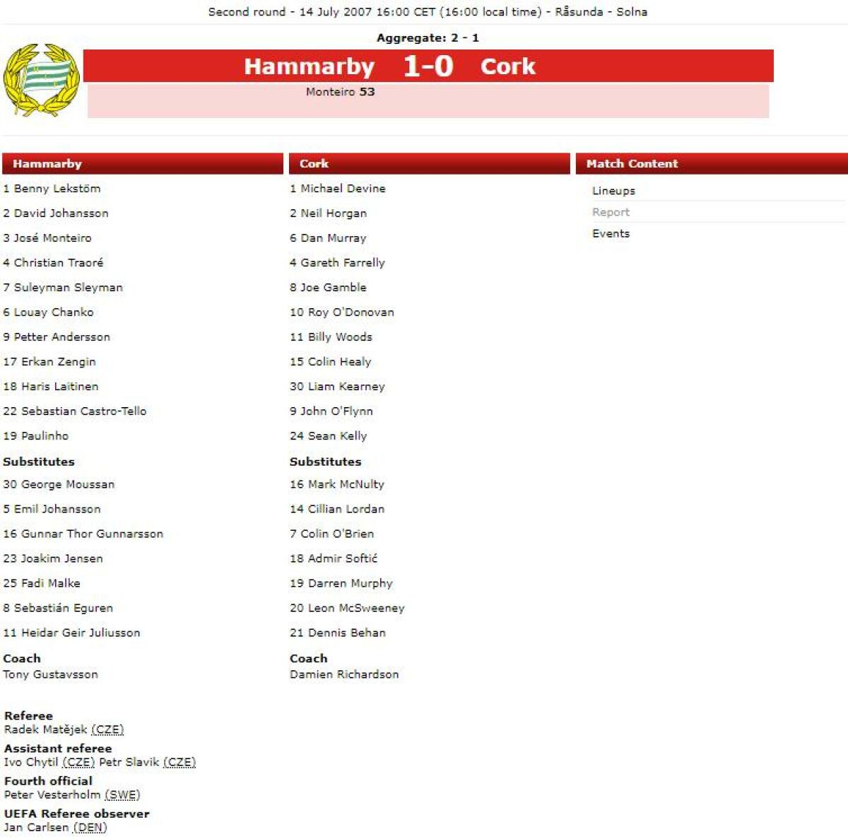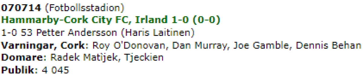 «Хаммарбю» Стокгольм - «Корк Сити» Корк - 1:0