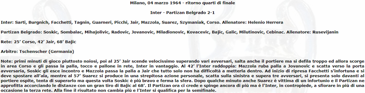 На 8-й минуте Факкетти получил травму и в оставшееся время находился на левом фланге нападения, не соприкасаясь с мячом. На 35-й минуте сломался Йованович и не смог продолжить игру. Матч не транслировалсяи по ТВ из-за забастовки сотрудников РАИ. Радиорепортаж шел только со второго тайма.
