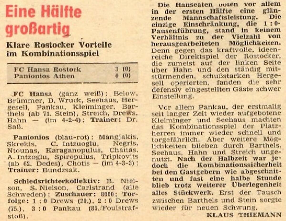 «Ганза» Росток - «Паниониос» Неа-Смирна - 3:0