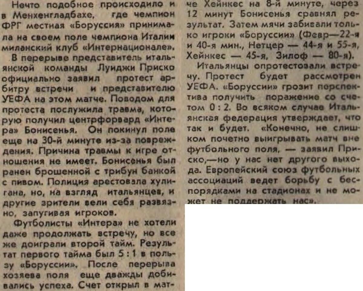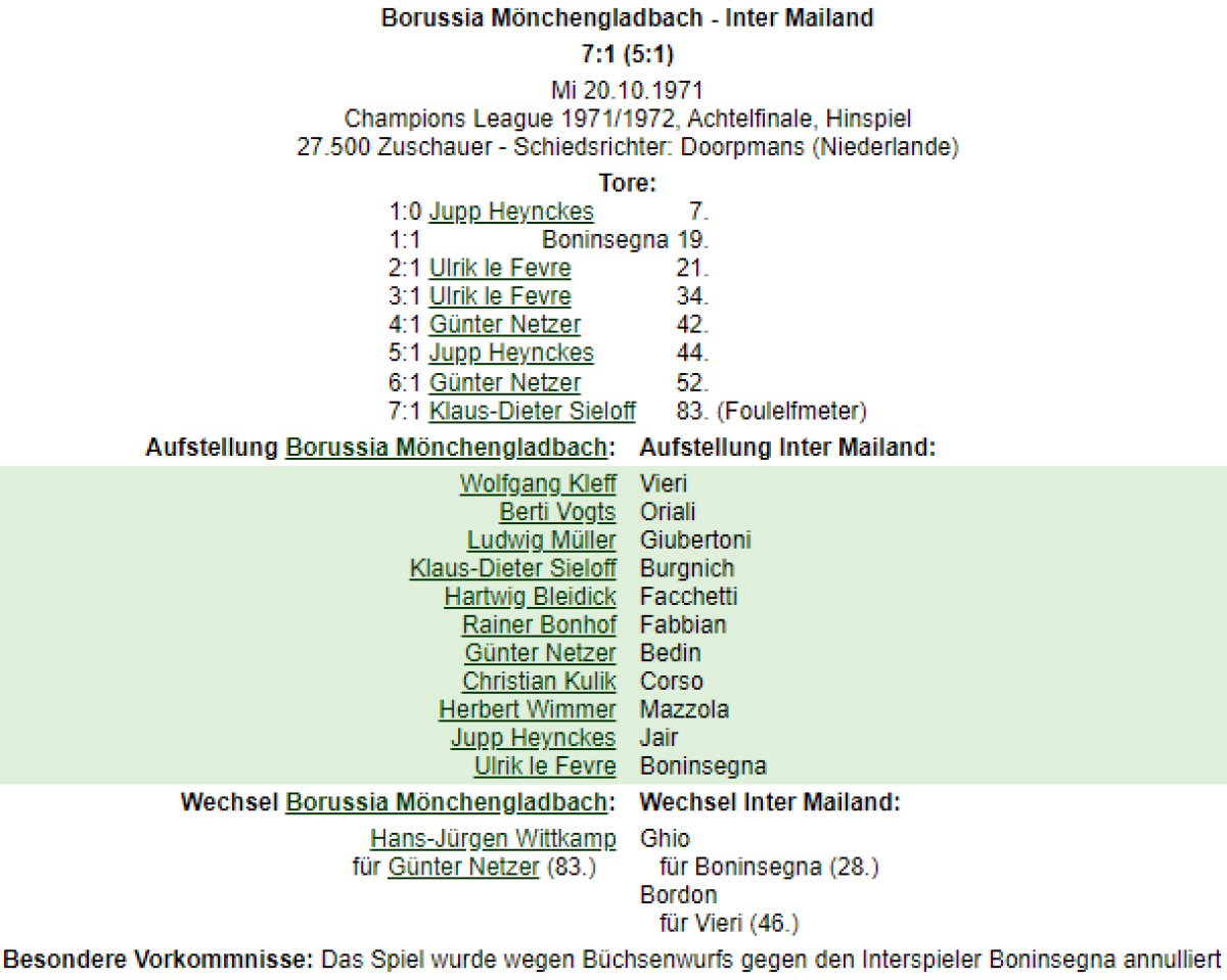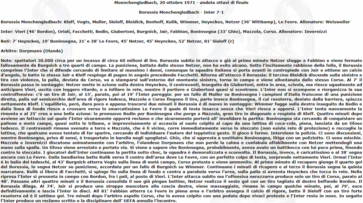 Результат матча был аннулирован и встреча была переиграна из-за того, что Роберто Бонинсенья был вынужден покинуть поле, после того, как в него попала пивная банка. leg 7-1. During the match, Roberto Boninsegna was carried off, allegedly having been hit b
