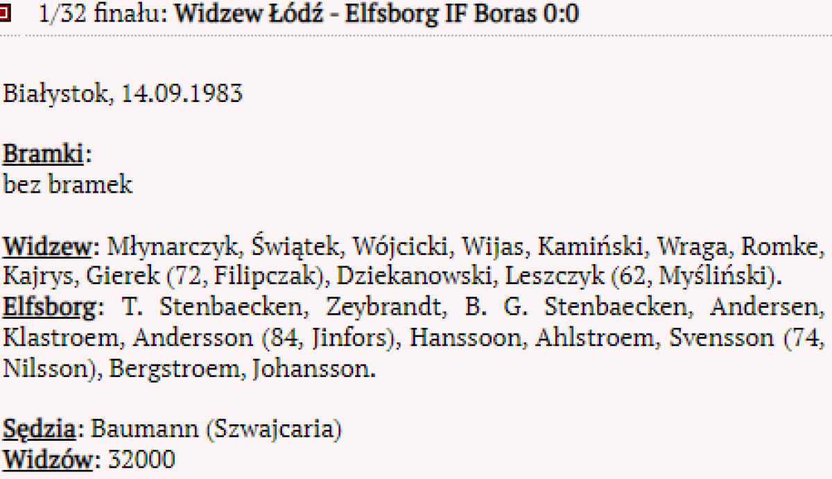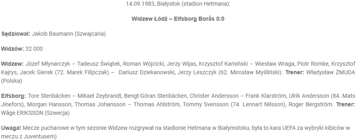 Из-за инциндентов со зрителями в Лодзи на полуфинальном матче КЕЧ Видзев-Ювентус (20/04/1983) УЕФА дисквалифицировала домашний стадион Видзева на еврокубковый сезон 1983/84. УЕФА обязала Видзев проводить домашние матчи в еврокубках не ближе 250 км от Лодзи. Видзев проводил матчи в г. Белосток.
