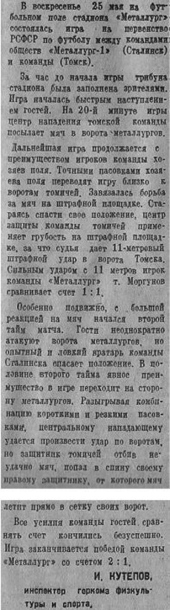«Металлург» Сталинск - «Торпедо» Томск - 2:1
