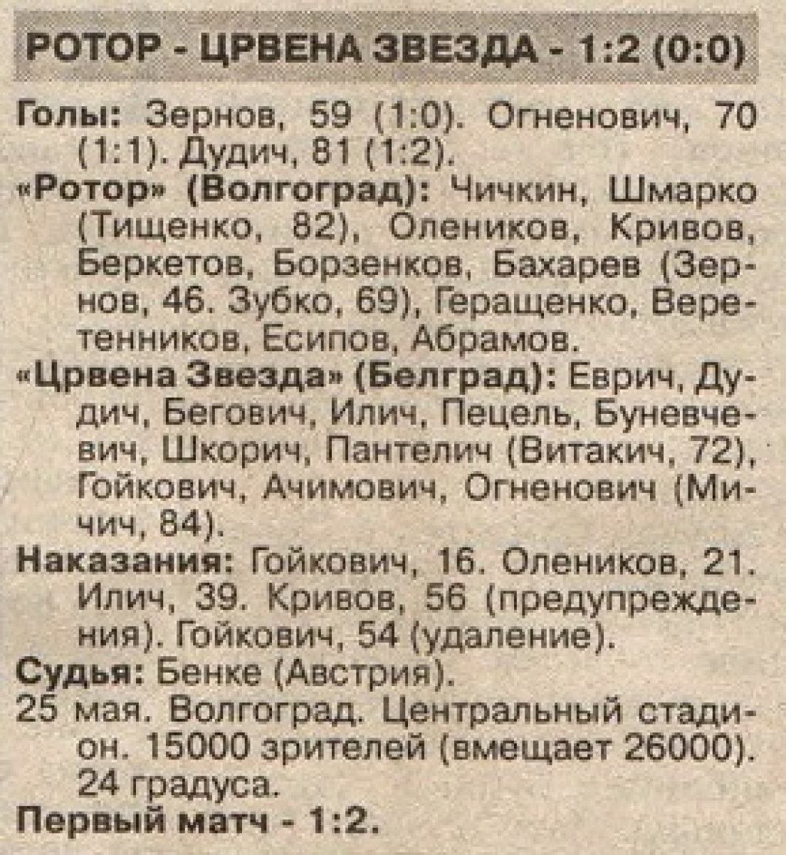 «Ротор» Волгоград - «Црвена Звезда» Белград - 1:2