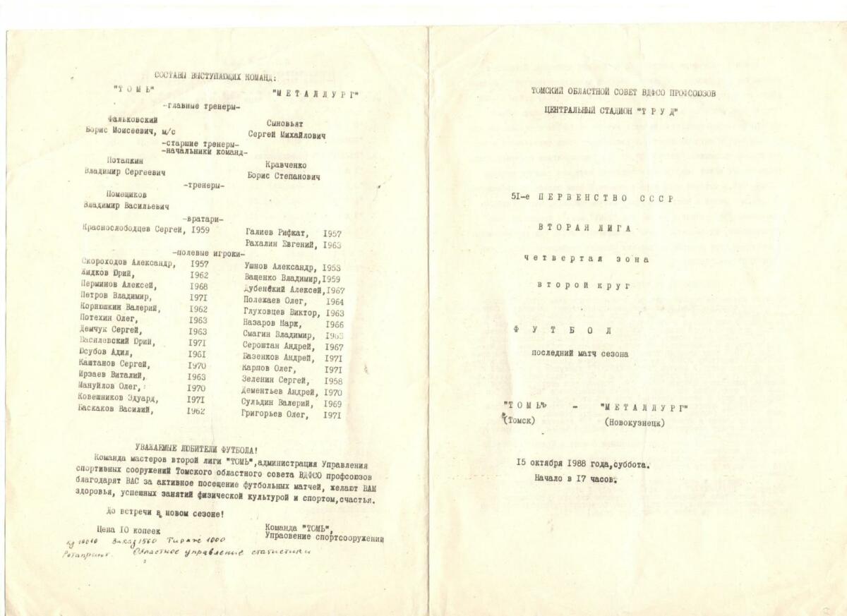 | 1988 | «Томь» Томск СССР |