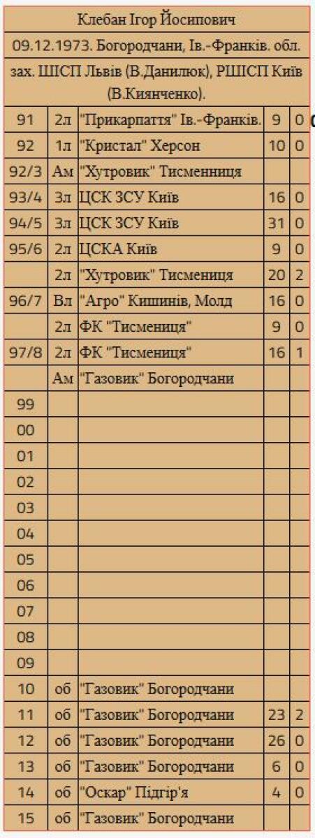 | 1995/96 | «Хутровик» Тысменица Украина |