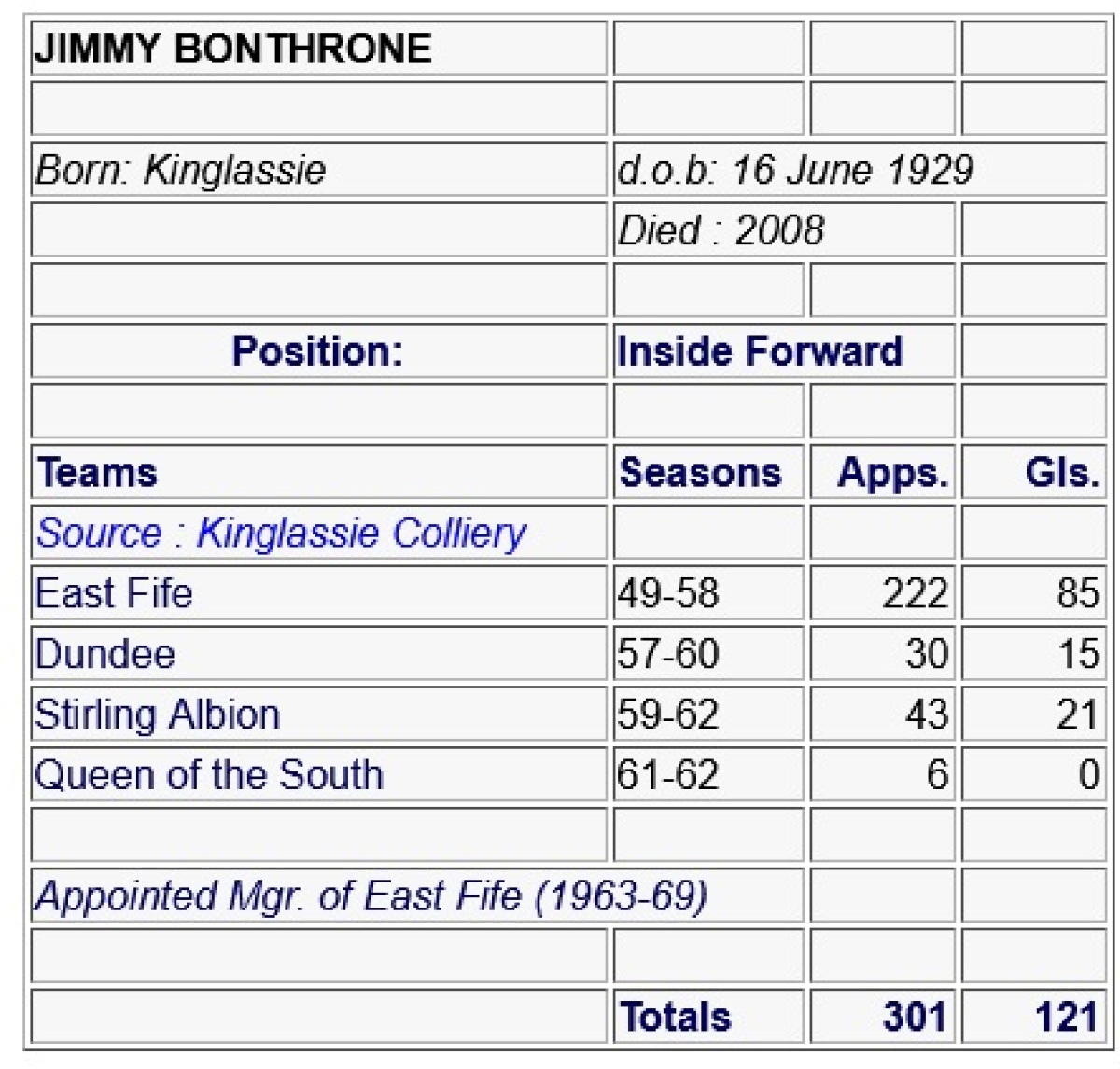 | 1956/57 | «Ист-Файф» Метил Шотландия |